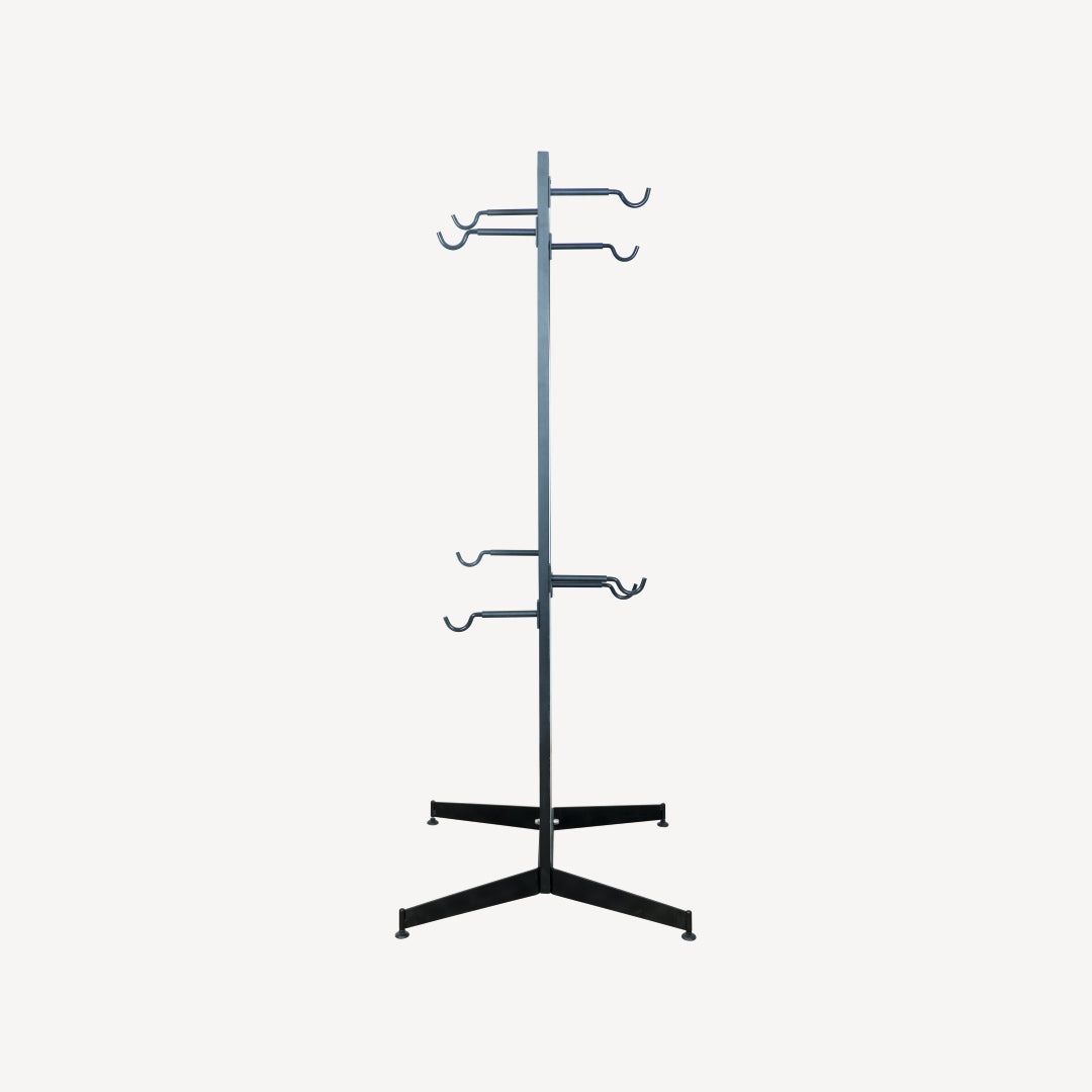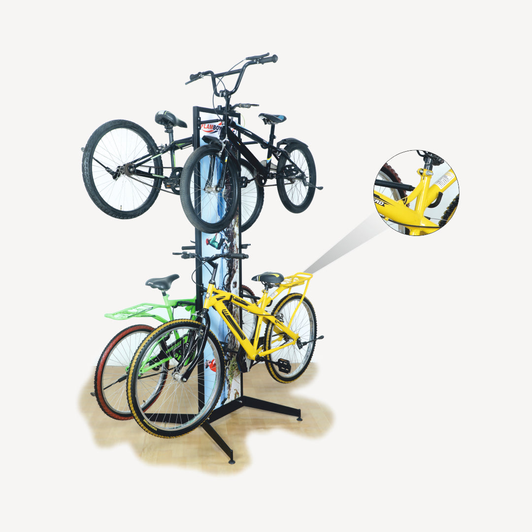 The 4 Bike Island Display Stand is a vertical, double-sided display unit ideal for showroom centerpieces or retail floor layouts. It can hold 2 cycles on each side, offering 360° visibility and optimal use of floor space. Constructed from durable steel and finished with a powder coating, this stand is suitable for Road, Hybrid, and MTB cycles. A dedicated branding space is available for promotional display.