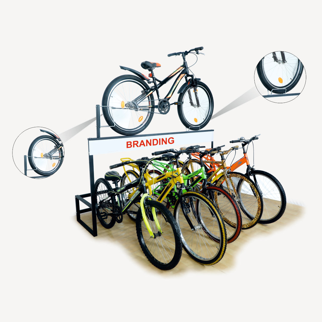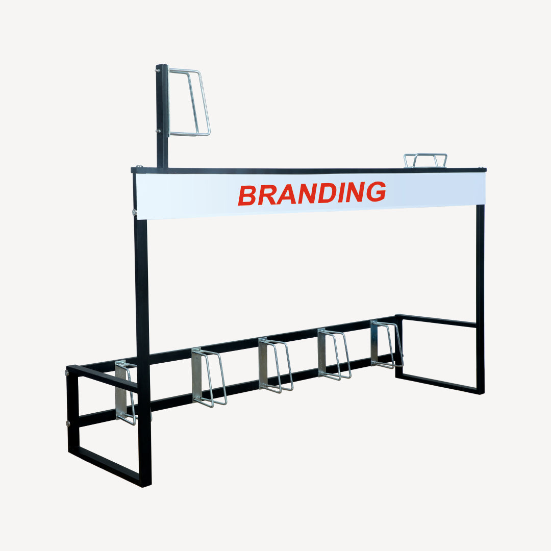The 6 Bike Display Stand is a high-capacity, space-efficient solution designed for displaying multiple bicycles. It offers easy DIY assembly and provides a convenient way to showcase 5 bikes on the lower tier and 1 bike on the upper tier. With an additional 77" x 6" branding space, this stand is perfect for retailers and showrooms looking to promote their brand while displaying bicycles. The stand is designed for Road, Hybrid, and MTB Cycles (without mudguards).